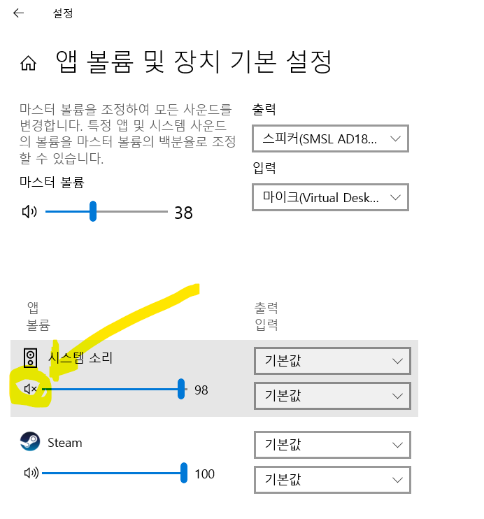 스피커 설정도 문제가 없는데