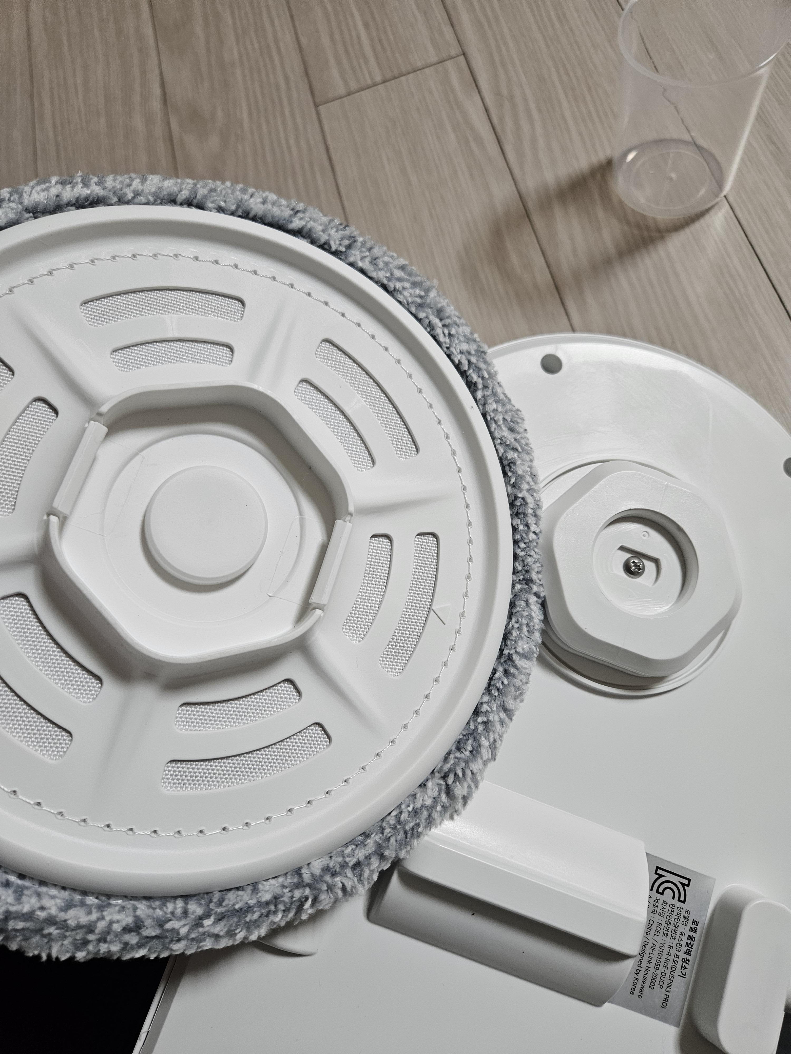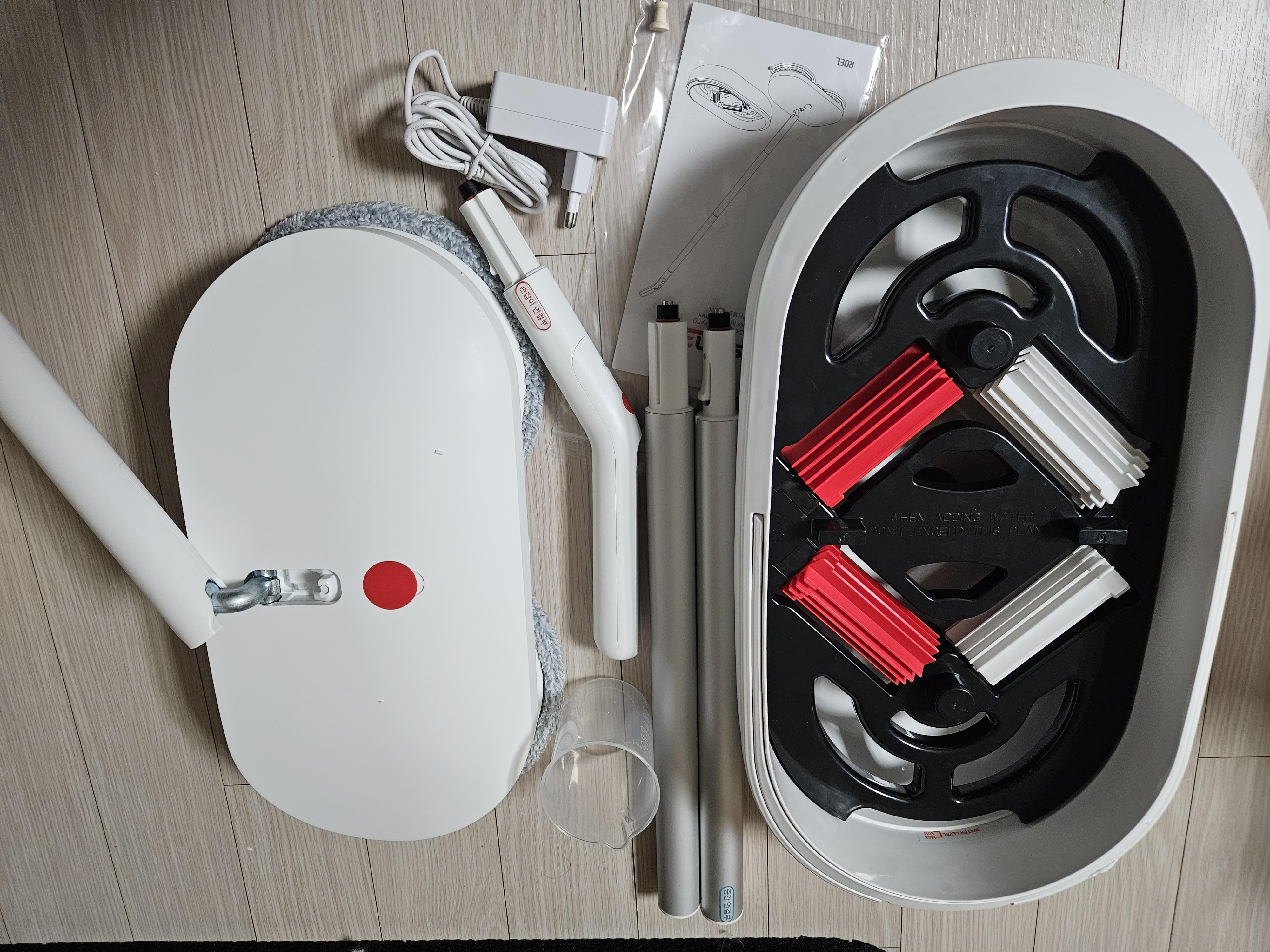 부품은 메인 본체, 기둥 2개, 손잡이 하나, 걸레 2개 그리고 세척통 하나,충전기, 물통으로 구성되어 있다.
